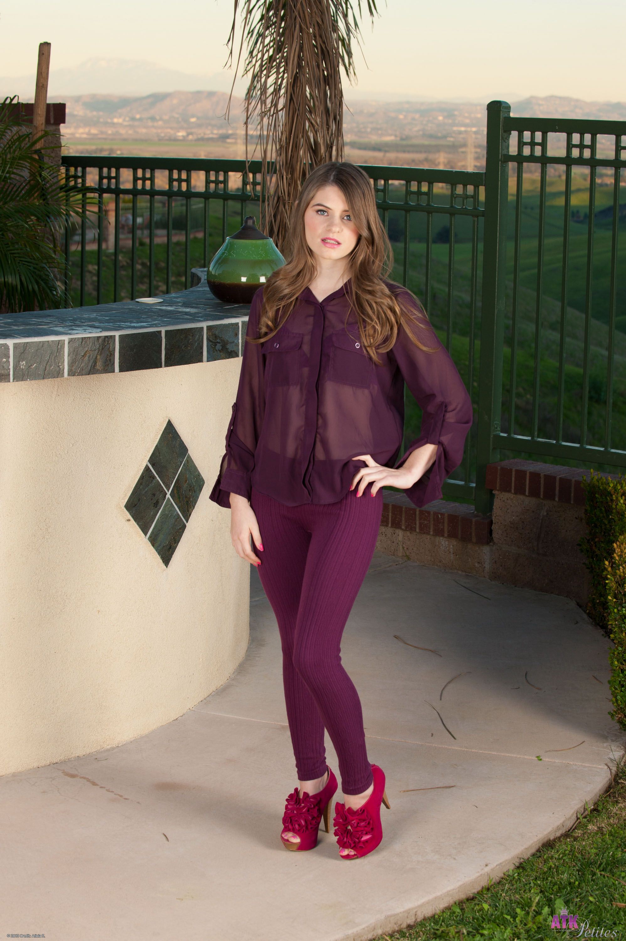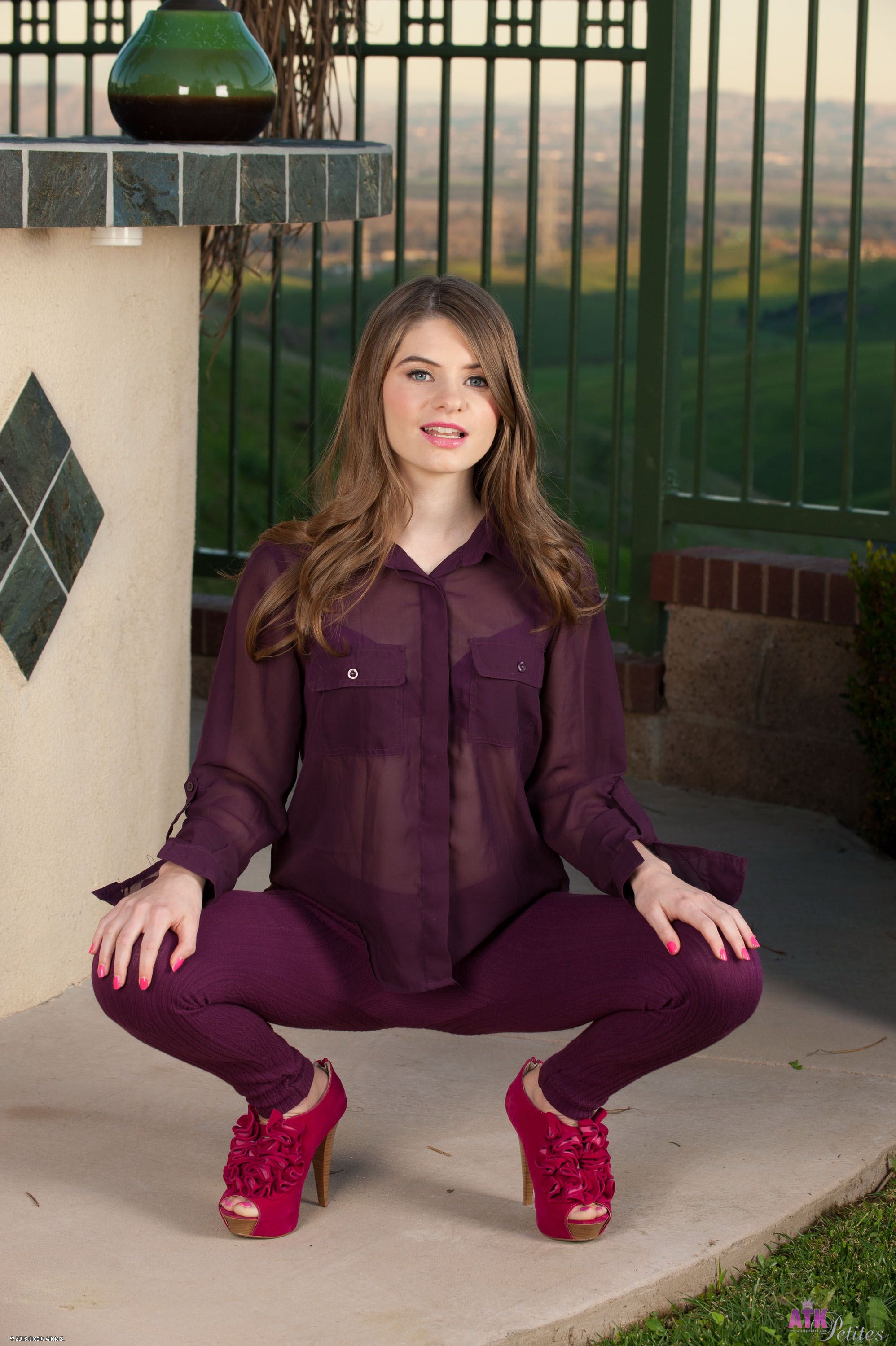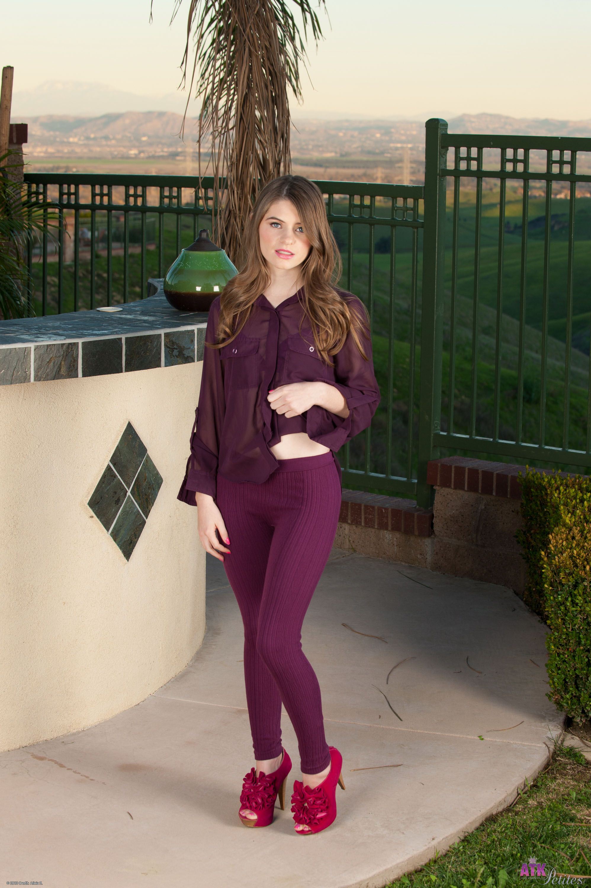 Alice March stripes off her clothes and gets naked against the sun setting in the back drop.