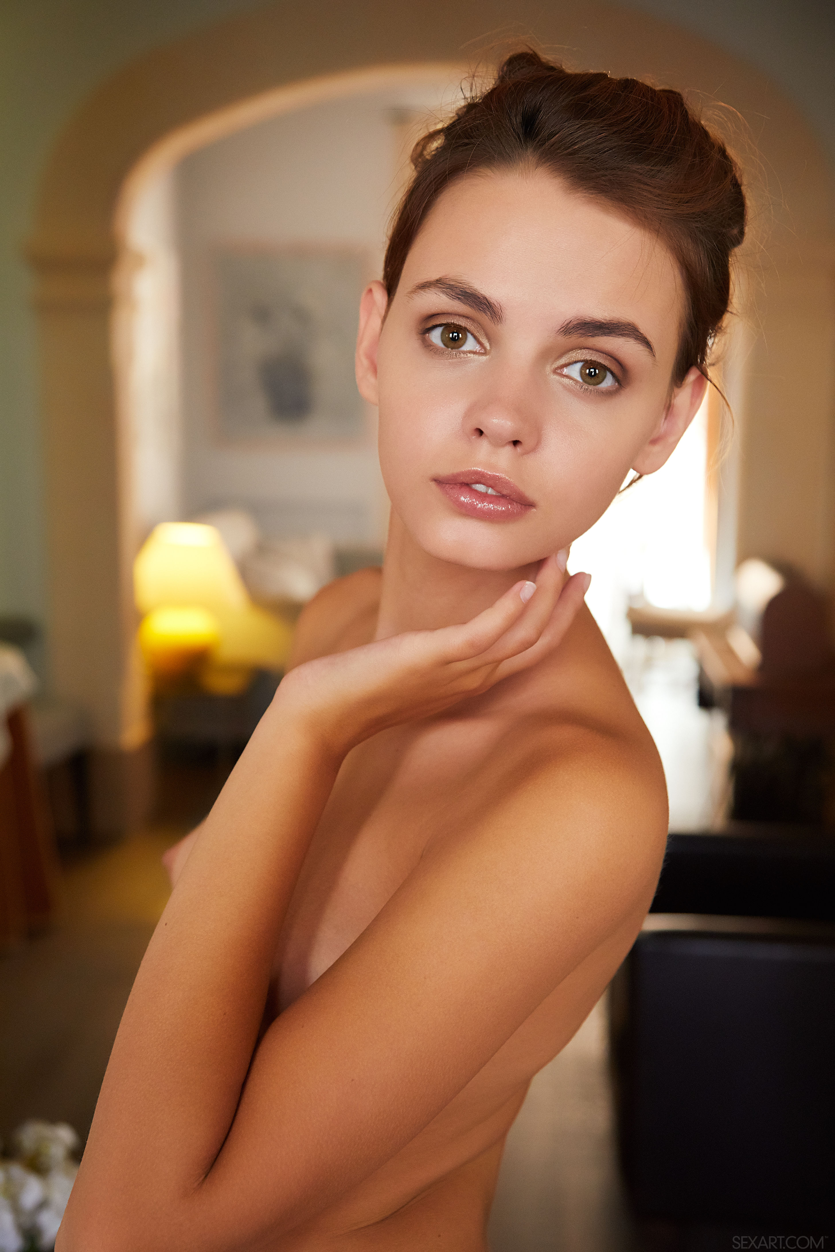 With a seductive look in her eyes that cannot be ignored, lovely Lilit A looks incredible in her crisp white dress. The tanned temptress sits and watches you, cool as ice. Leaning forward, she drops one shoulder and exposes a pert breast, smiling as she reveals her nipple. Sitting back, her legs open and her dress rides up her thighs until her naked pussy is on show. With both hands she touches herself, gently stroking her clit before pulling her lips open to reveal everything inside. The beautiful brunette turns onto hands and knees, hands roaming over her ass to pull and clutch at her pussy, spreading herself wide open, irresistible.