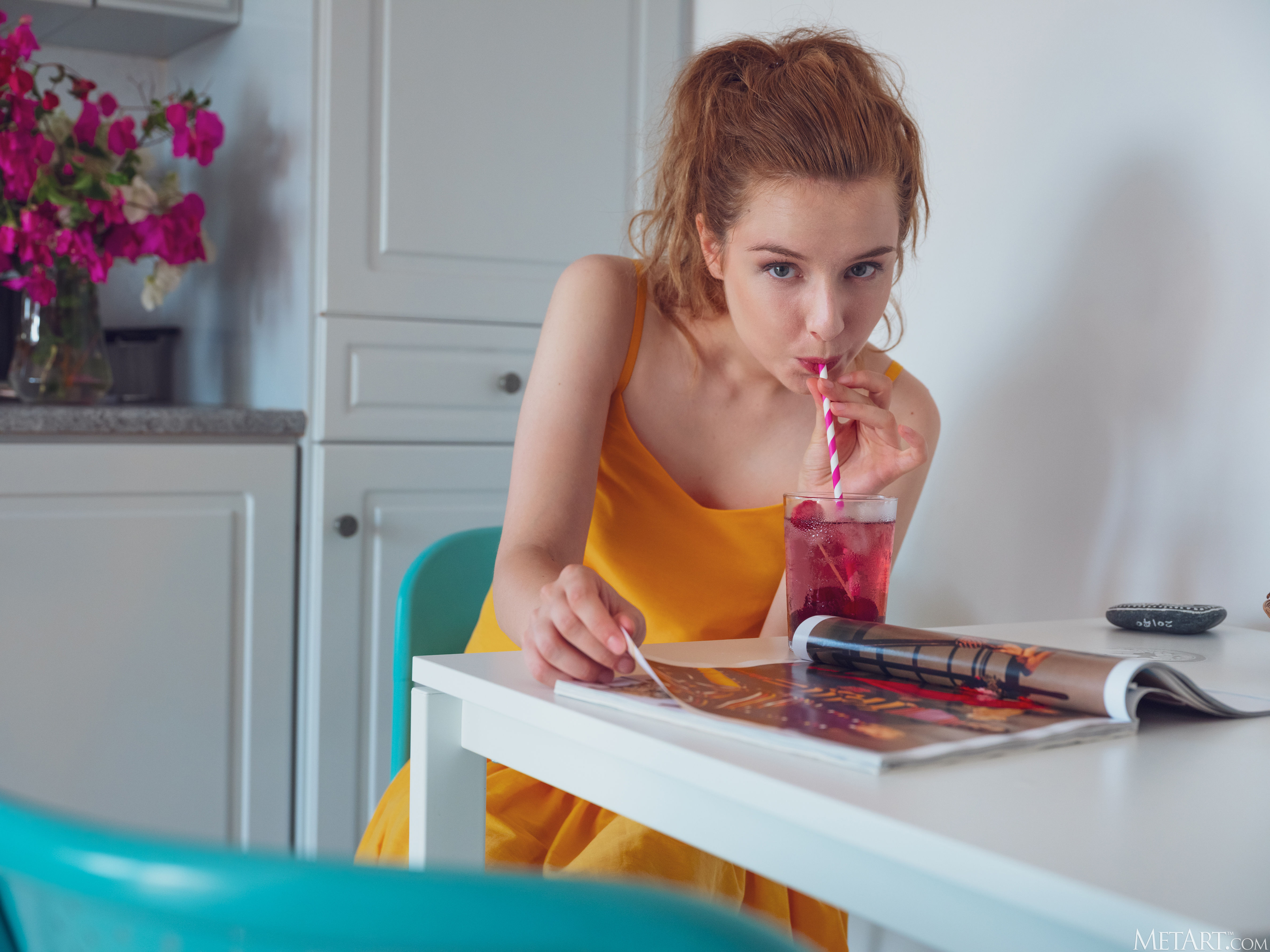 Join stunning Sienna in the break room and the vivacious redhead will make your day so much more fun. Her green eyes sparkle flirtatiously as she lifts her dress and tugs at her cute cotton panties for an upskirt glimpse of her shaved pussy. Letting her long hair down from its ponytail and taking off her clothes, she perches naked on the countertop, caressing her puffy nipples and grabbing her sexy ass cheeks invitingly.