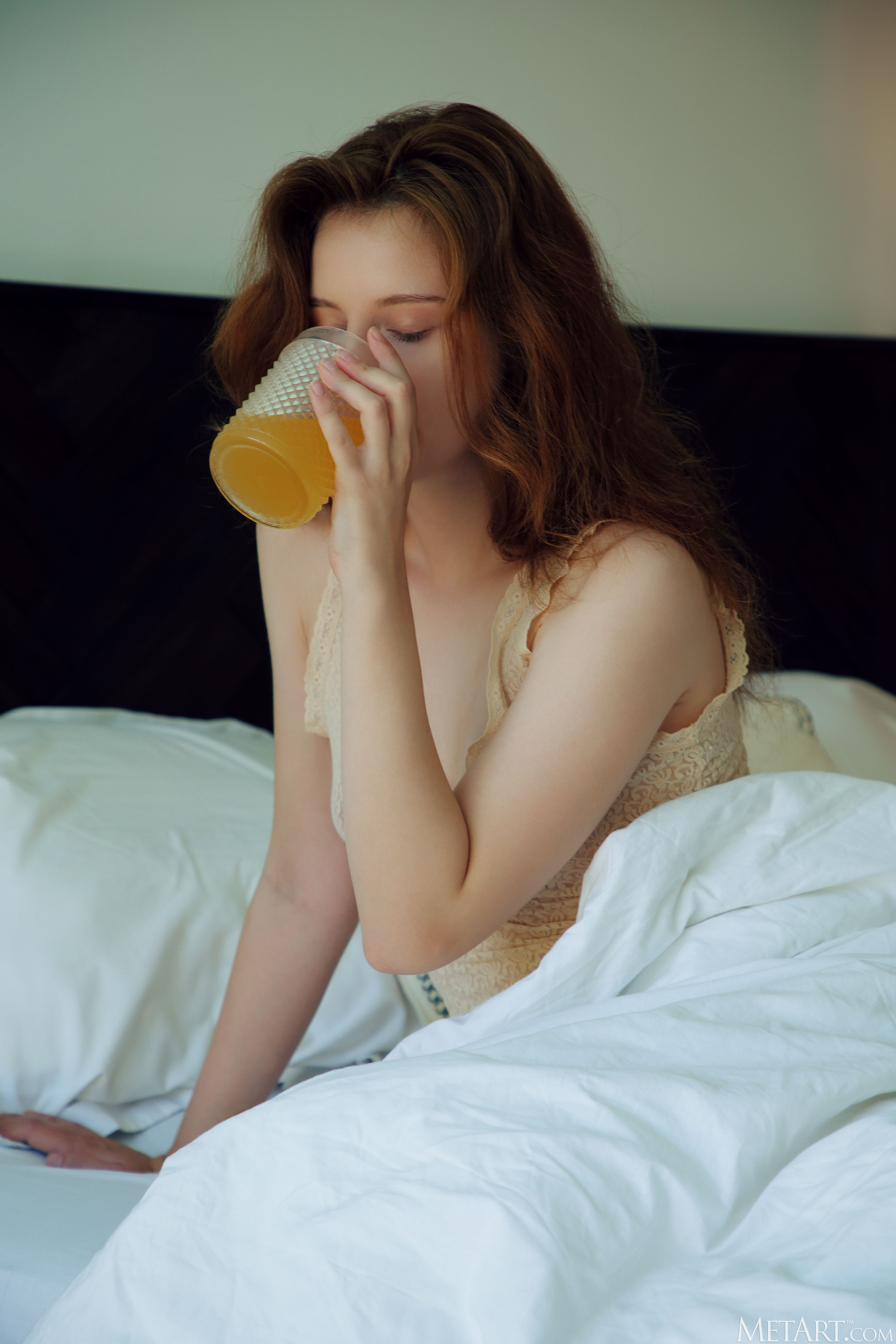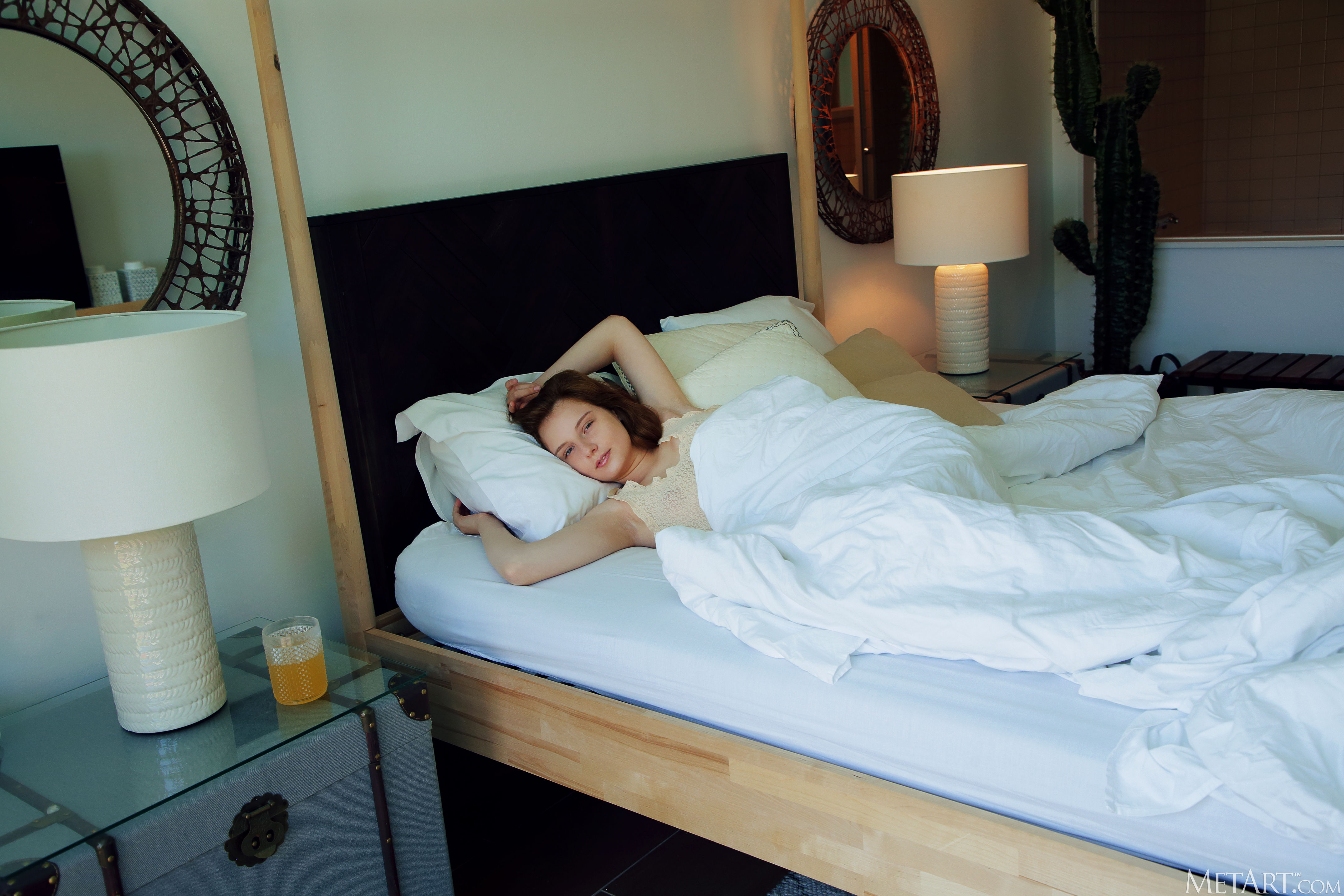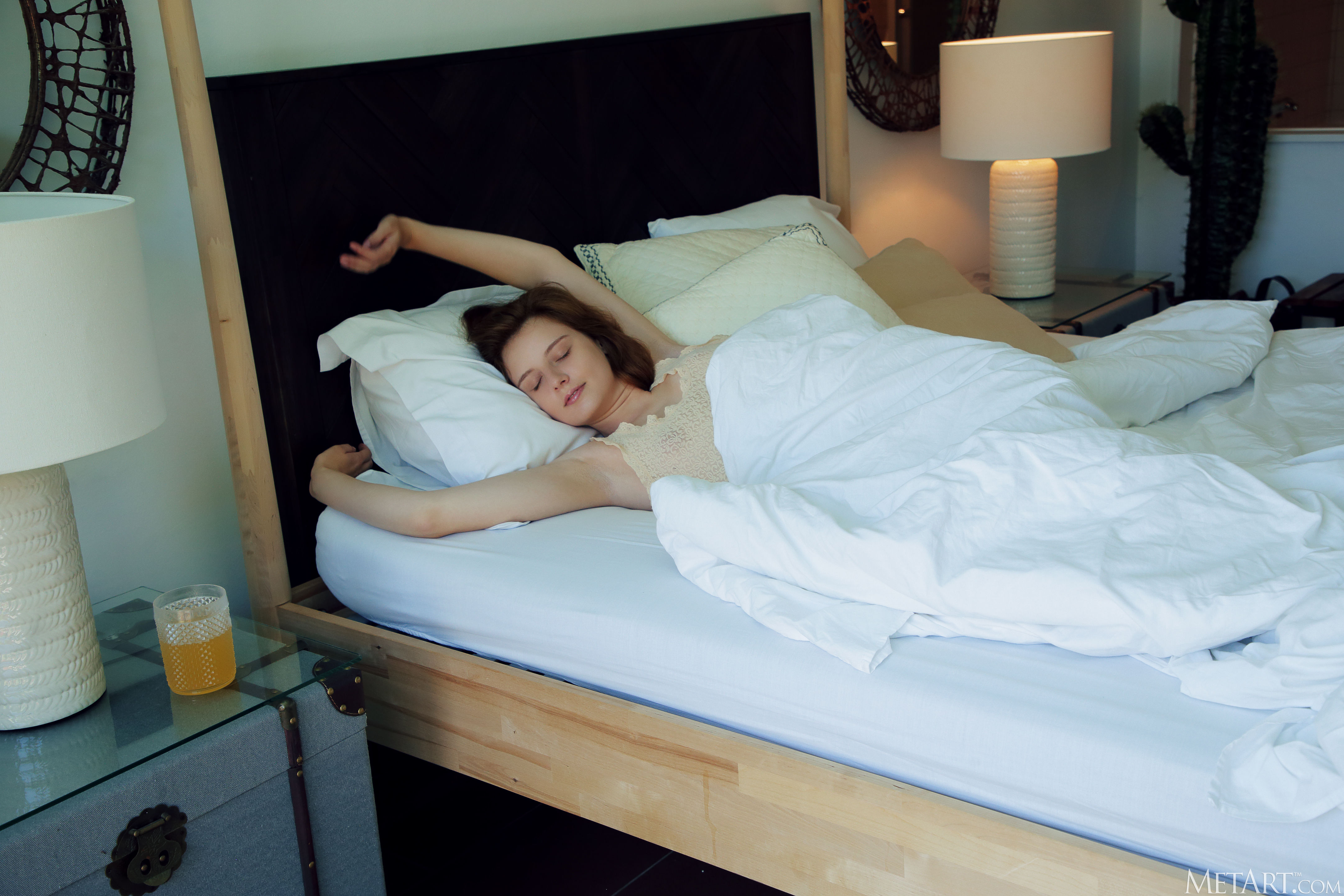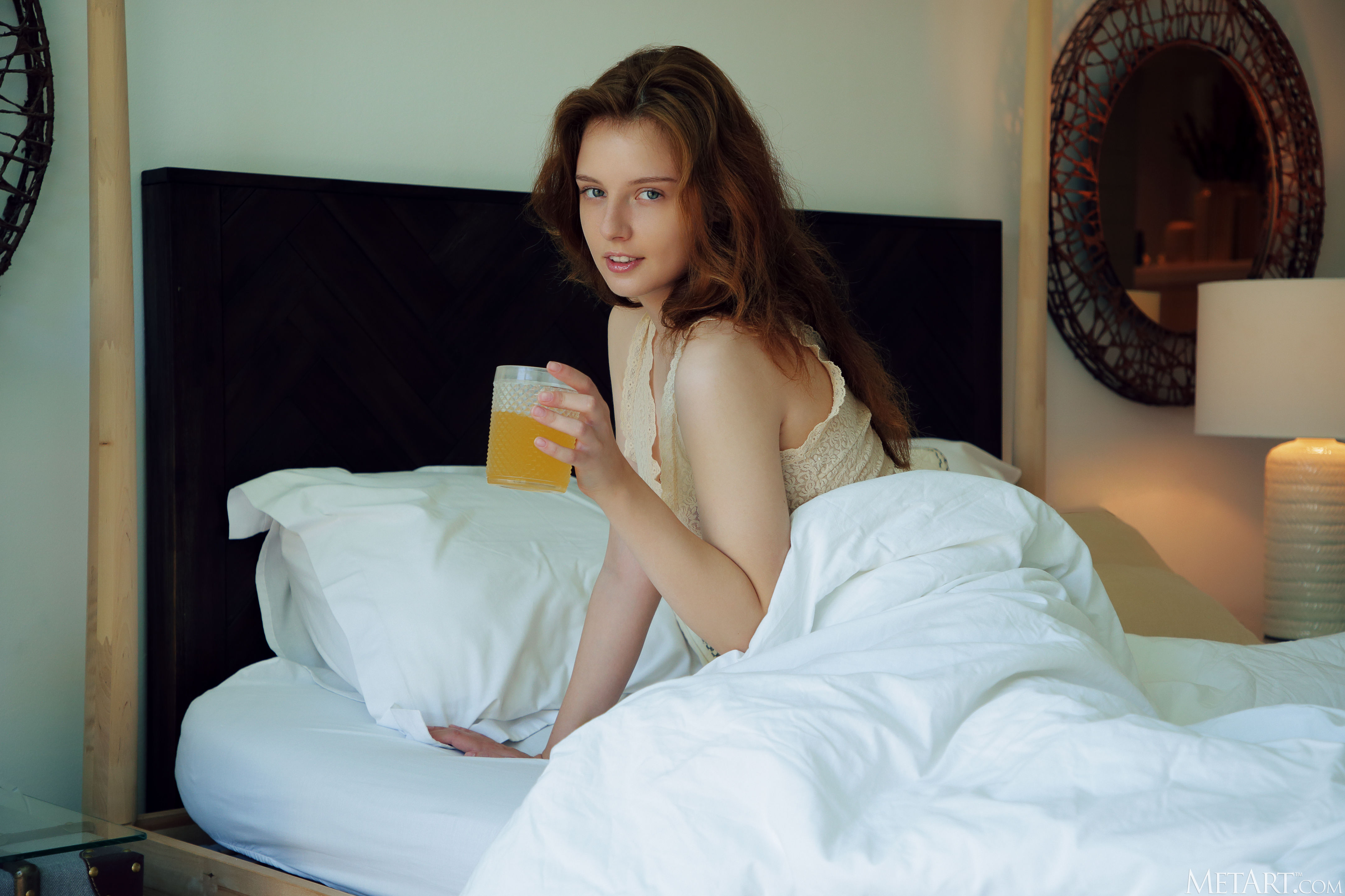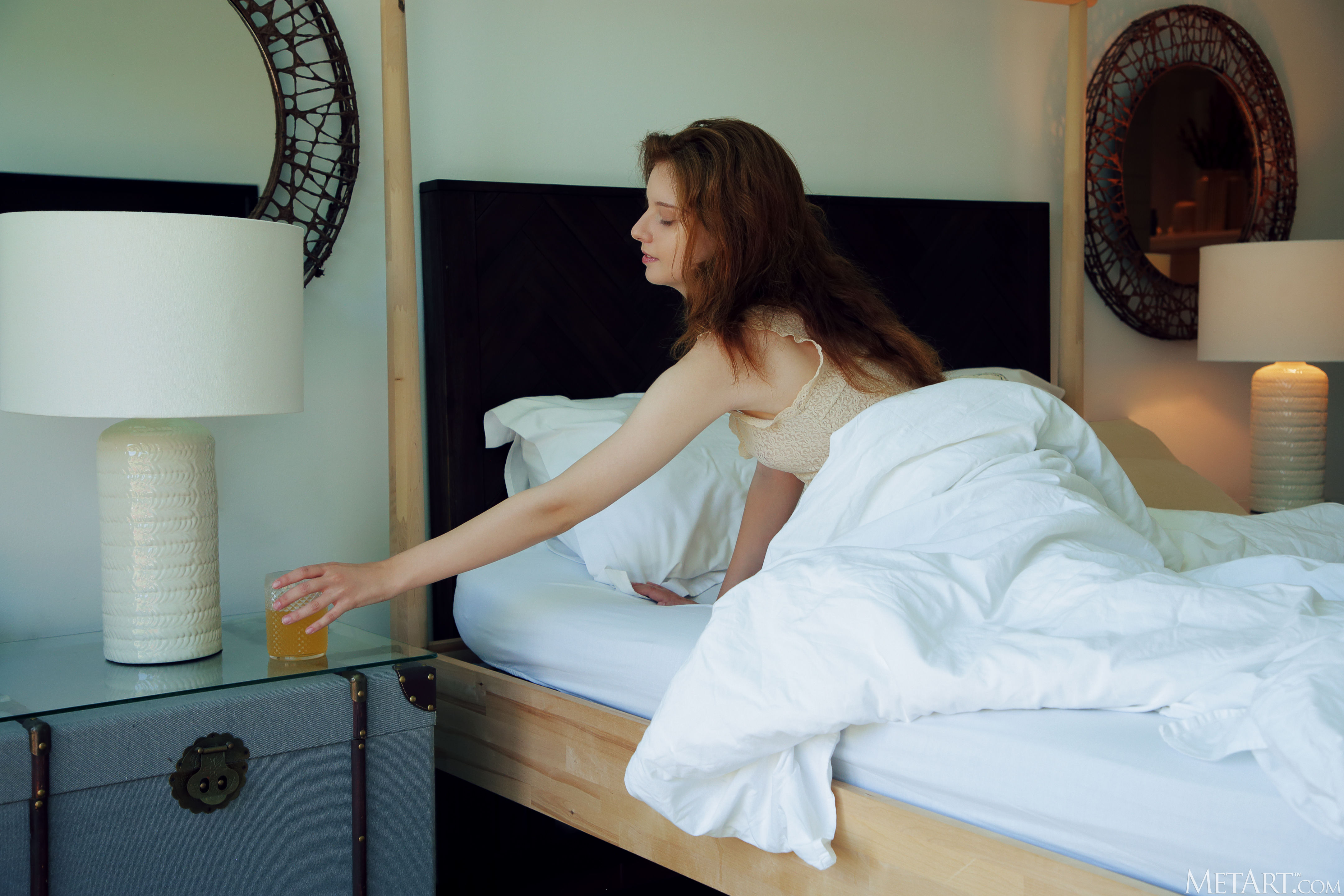 Cute redhead Sienna awakens in a sensual mood, flinging back the bedcovers to reveal that she's not wearing panties with her lacy top. The intricate folds of her shaved pussy are flushed a deep pink as she parts her slender thighs, hands wandering over her perky breasts until her puffy nipples stiffen to delicious peaks. Getting naked, she rolls around on the sheets, going face down ass up as she indulges her craving for pleasure.