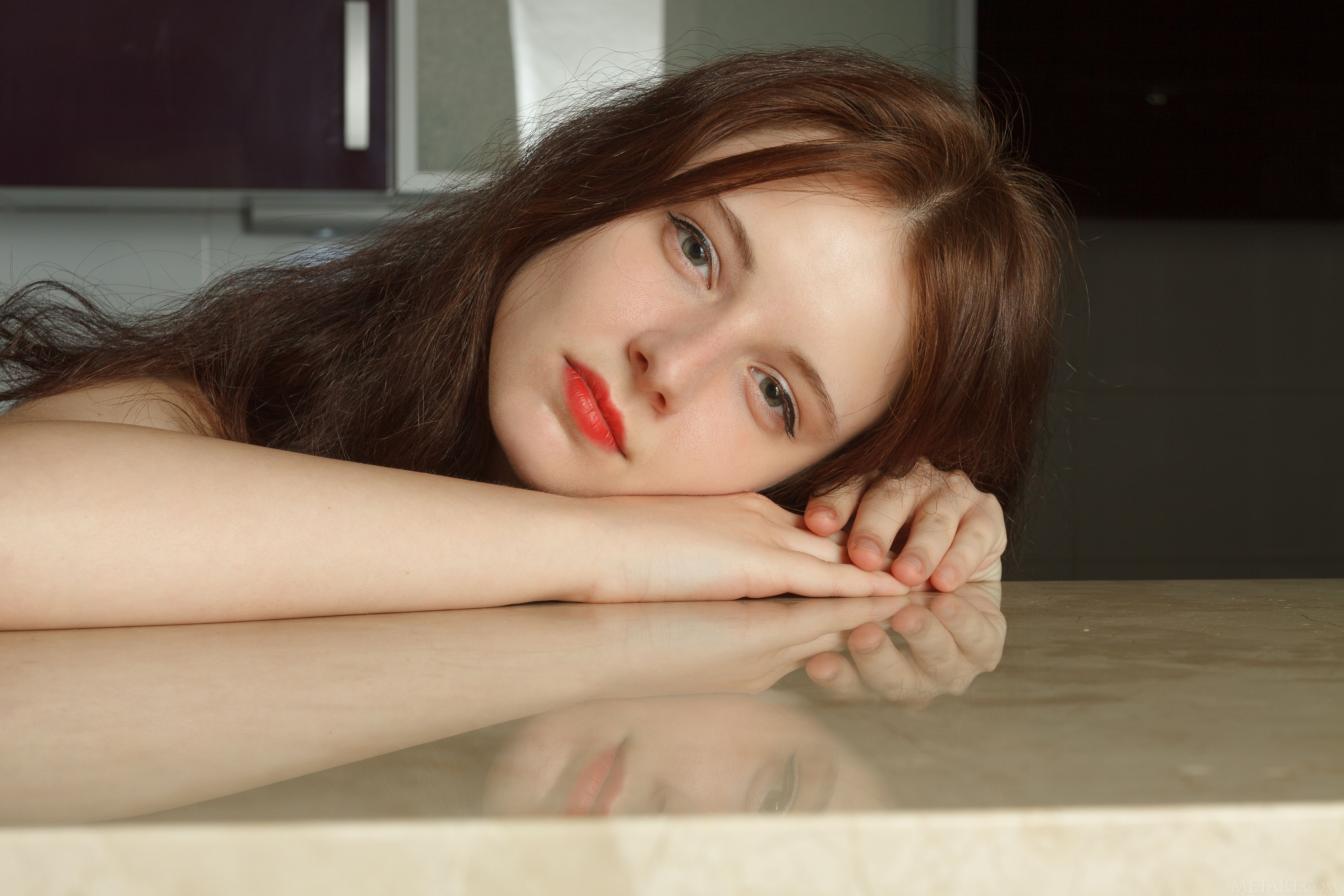 Sexy brunette Sienna welcomes the morning in bright red lipstick that makes her lips even more kissable. The cute Belarusian babe lets her silk robe fall open to expose her perky breasts, big puffy nipples so alluring. Her gorgeous green eyes are flirtatious as she flaunts her shaved pussy, then straddles a chair naked for a delicious rear view of her curvy ass.